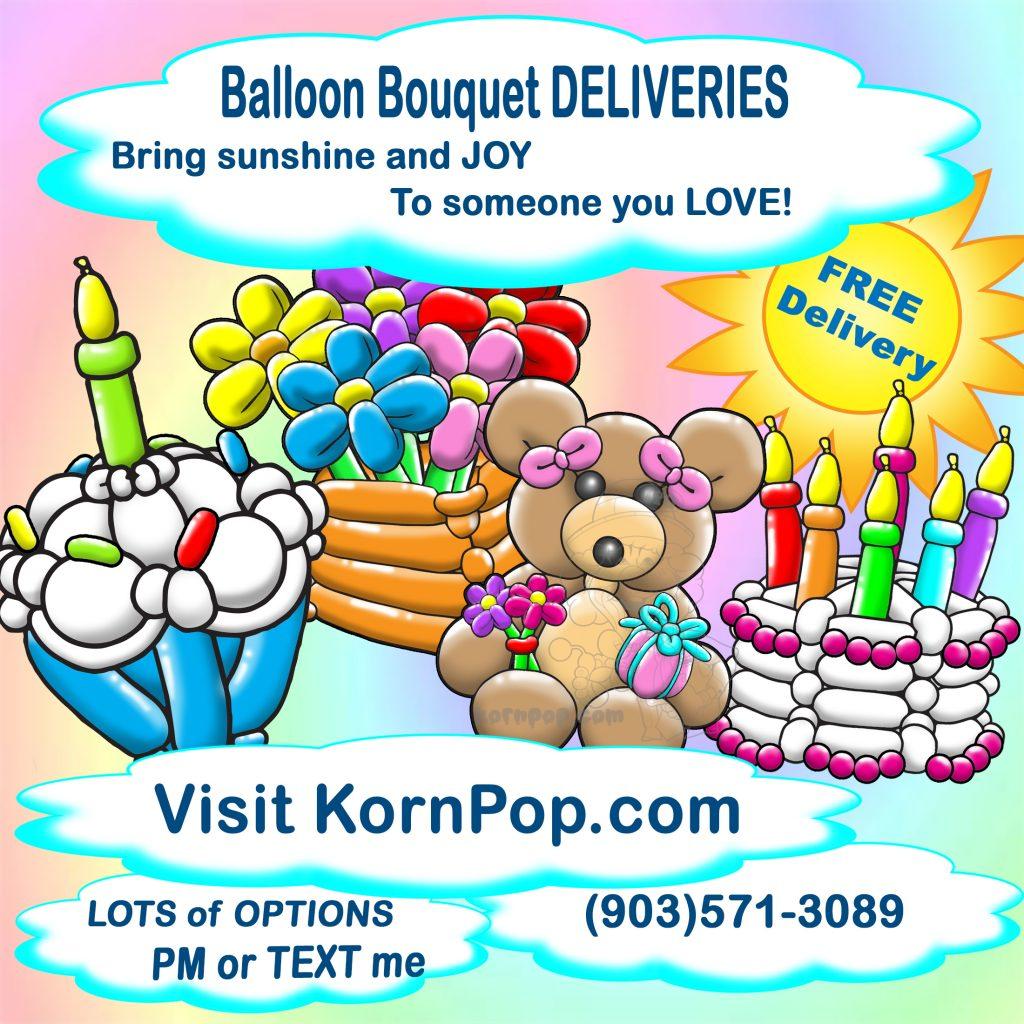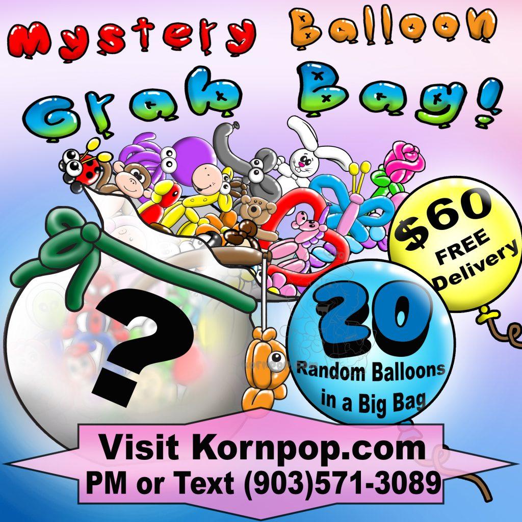 Have a special event coming up and can’t have an artist on site (budget, calendar, or location constraints). Kornpop can help you celebrate. Have fun with a Big Grab Bag of Balloons for $60, Local delivery in Tyler and Athens area included.