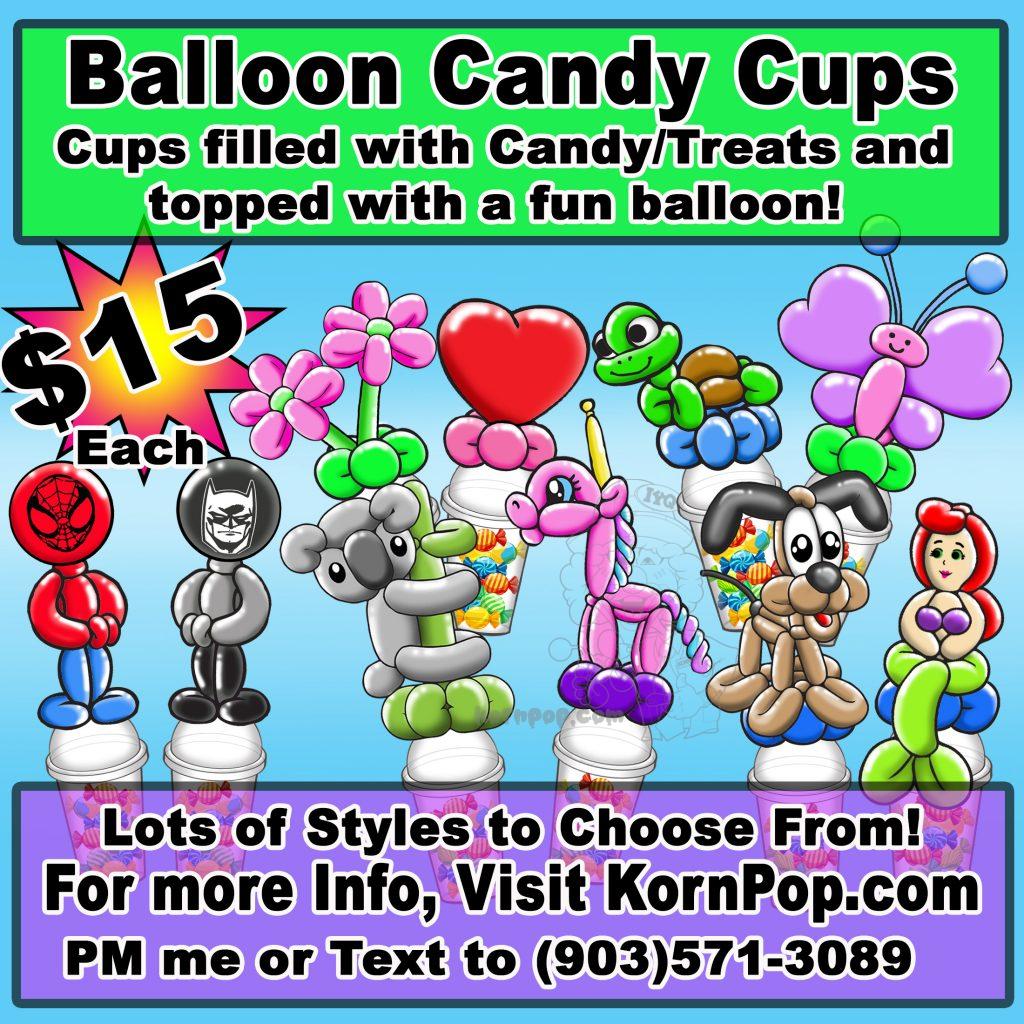Upgrade one of the balloons to a candy cup for $3, or 2 for $5. If it’s a birthday, add a birthday cake for $15, with a free candy cup for the birthday child.